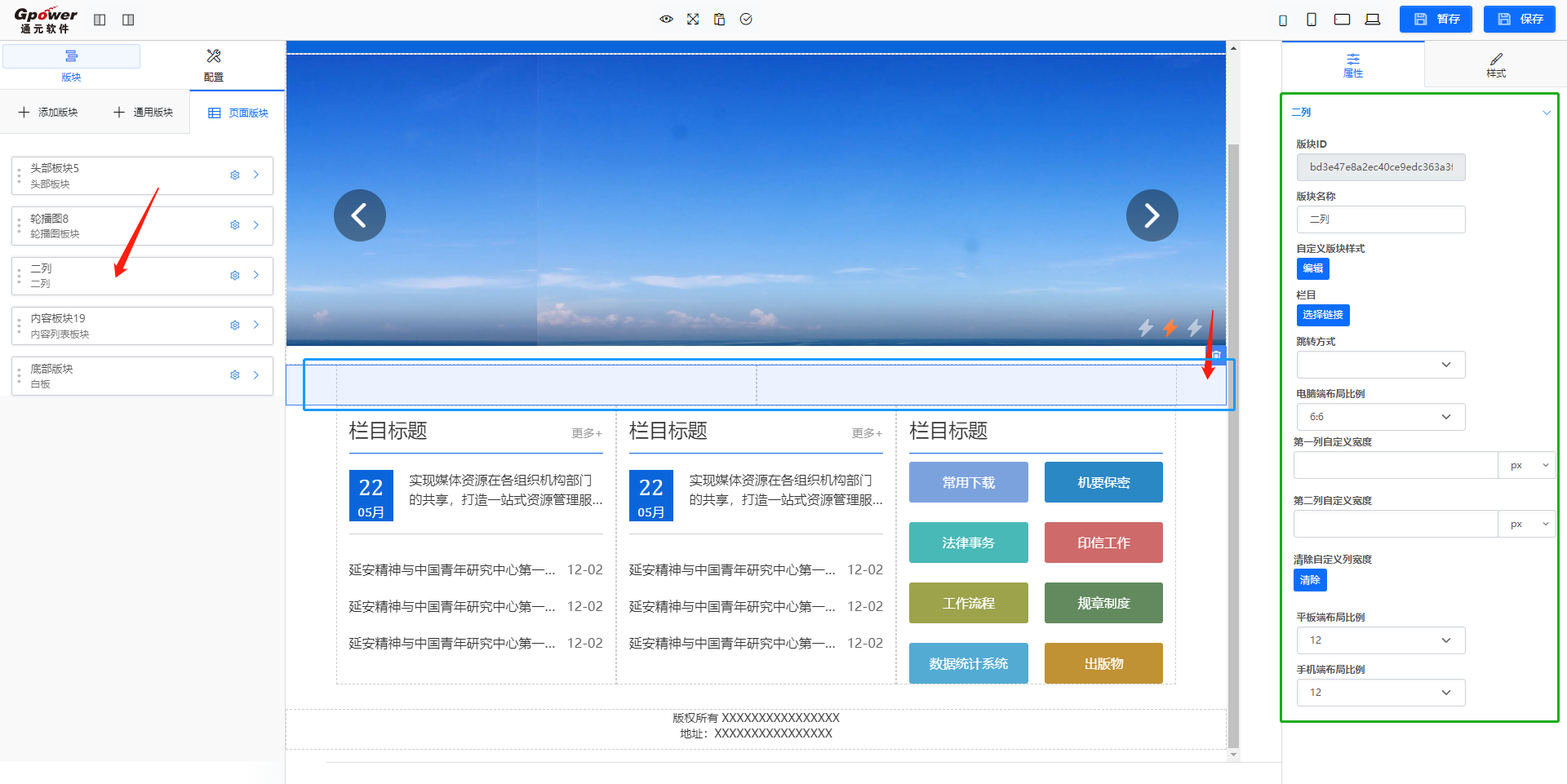 三、空白版块可以通过属性来自定义各列的宽度、为版块绑定栏目等。