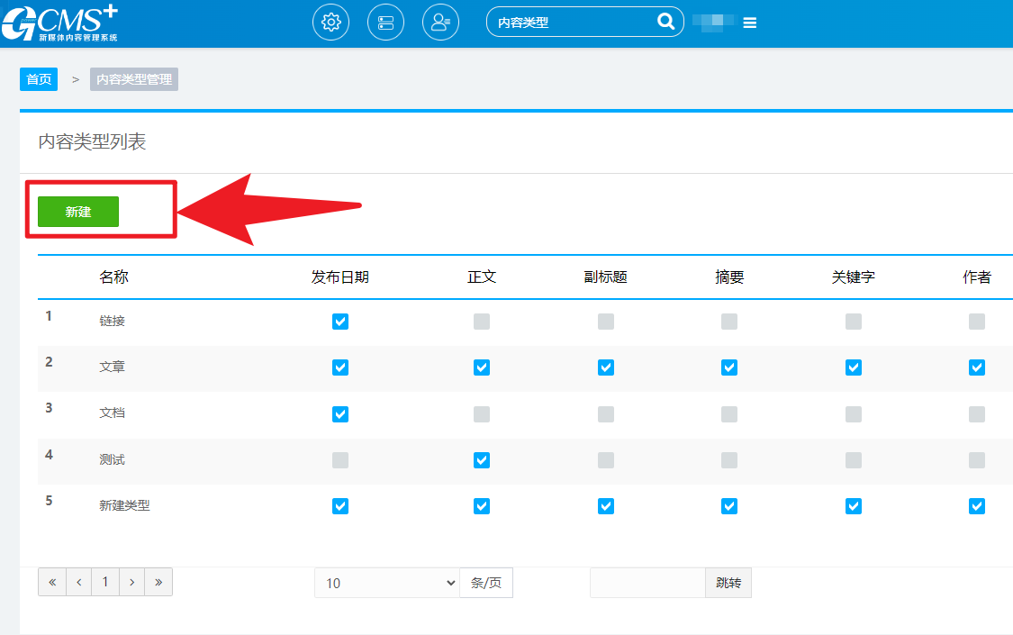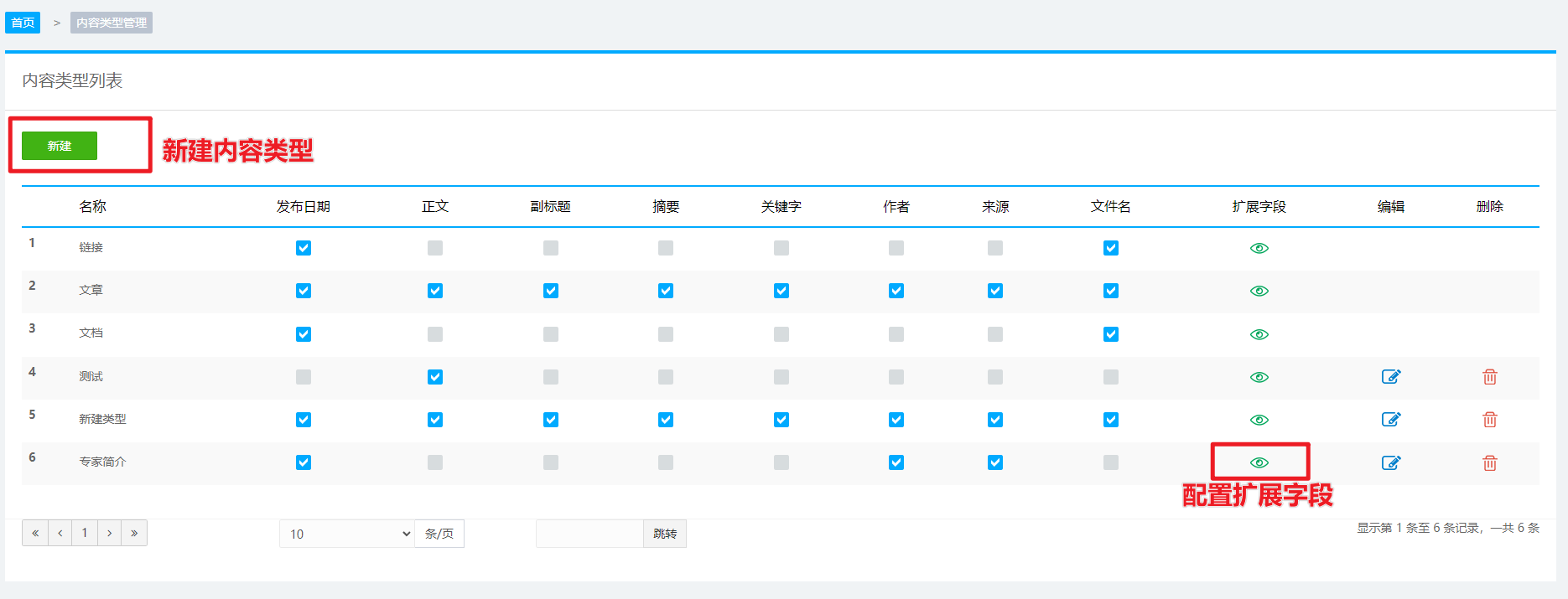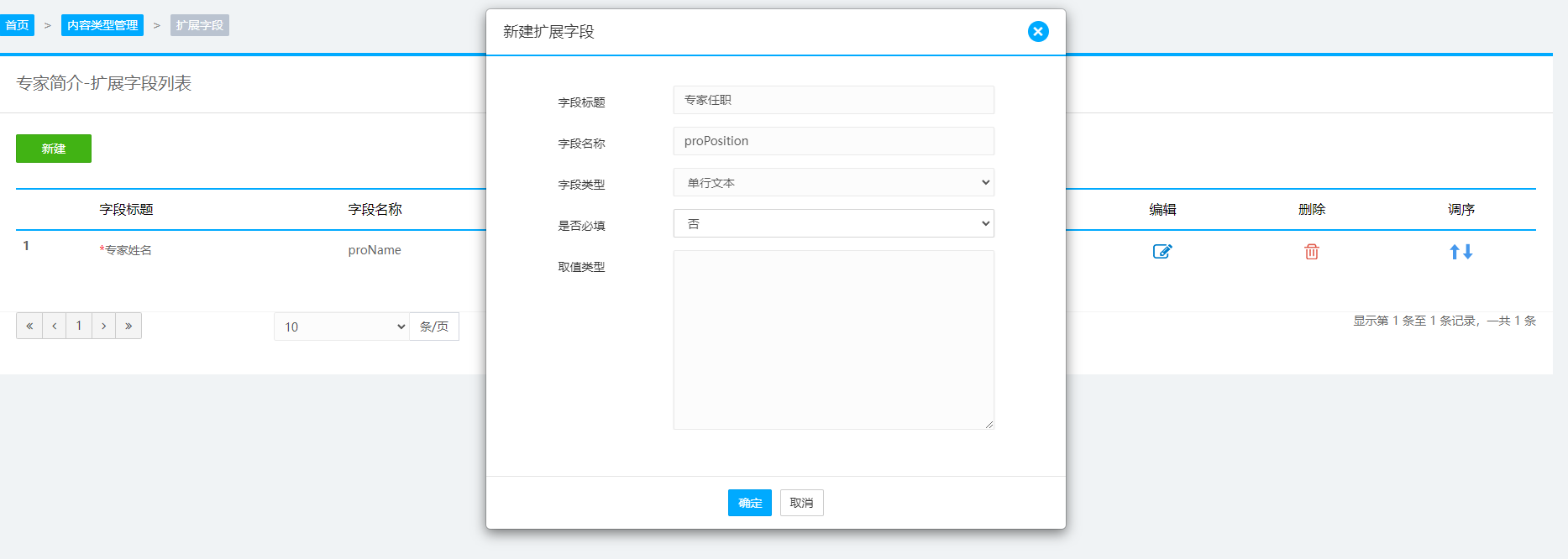 配置完成基本内容字段配置后,为该类型添加扩展字段,用于接收以上数据源中的字段: