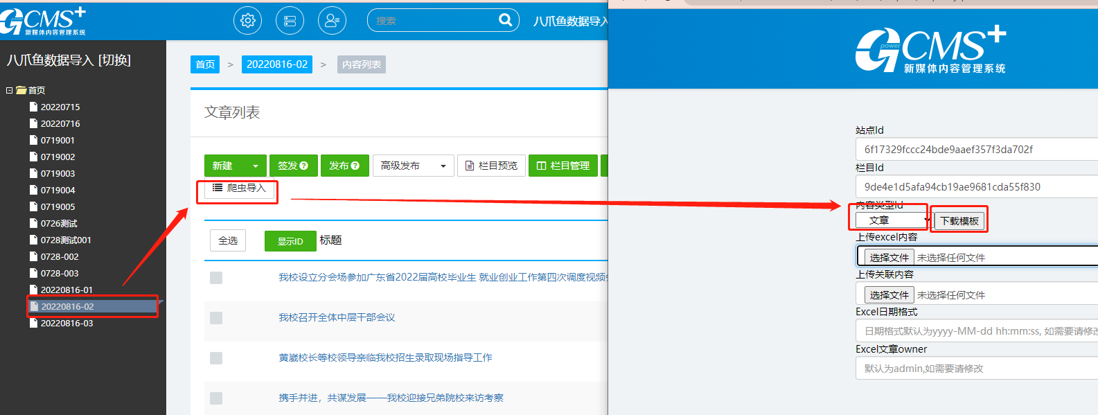 此处需要注意,数据导入是以栏目为颗粒度执行的,需核验站点id和栏目id是否已填充,这两个字段是作为数据源导入目的栏目的必填项,可以判断获取指定内容类型的依据;