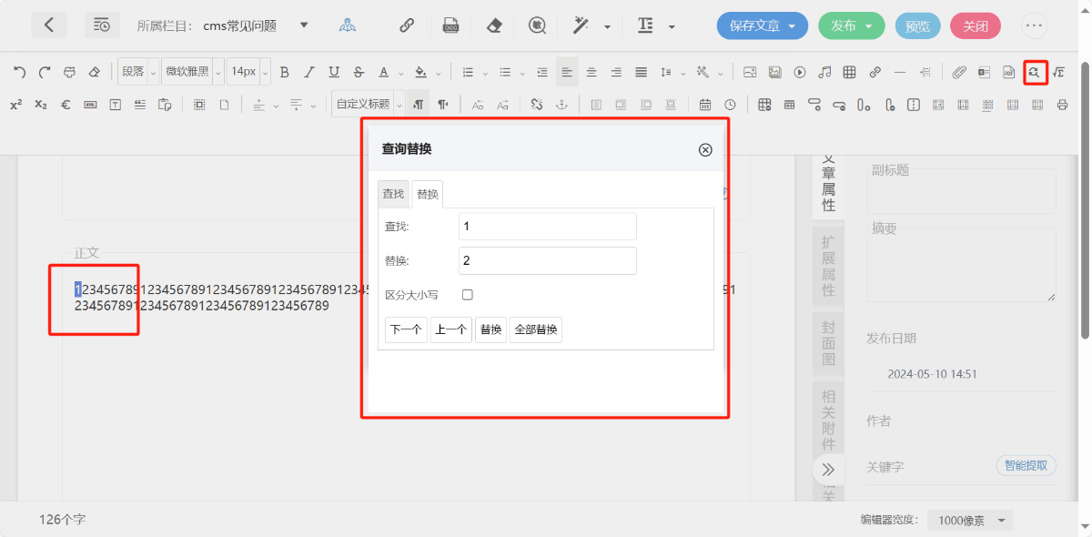 在文章中查找对应字或句子,选中替换。