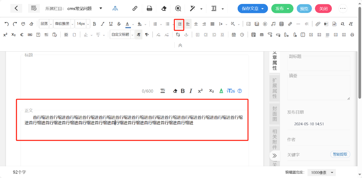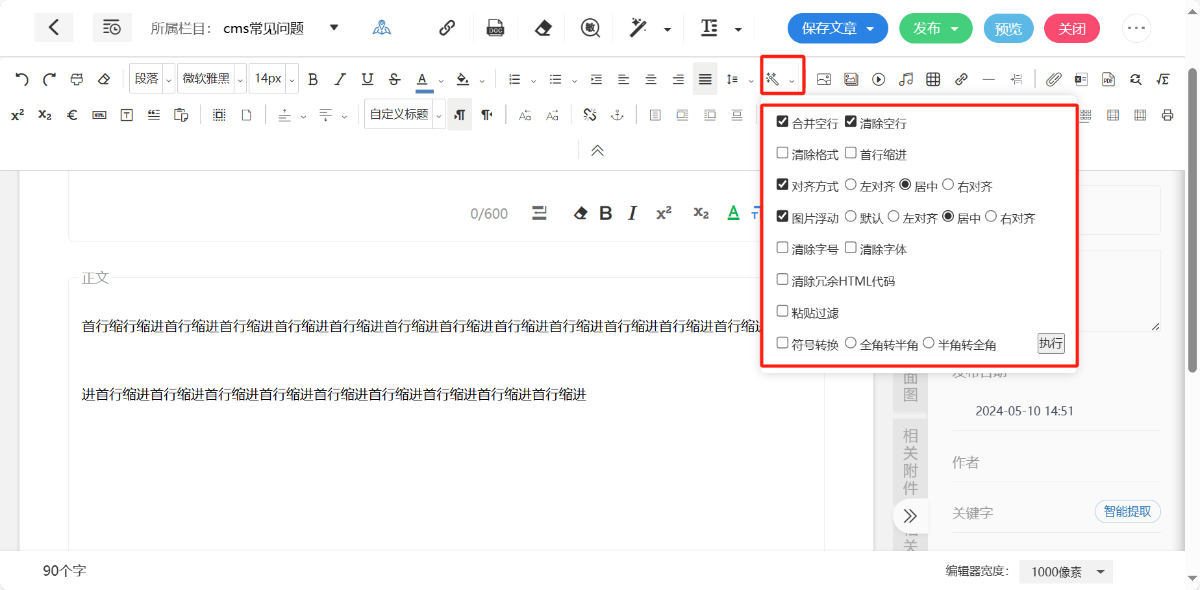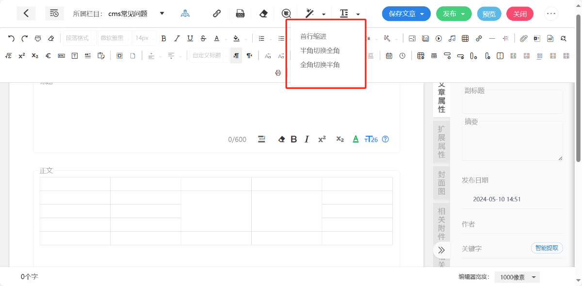 可以给编辑器中的内容进行快速格式操作,支持“首行缩进”“半角切换全角”“全角切换半角”;