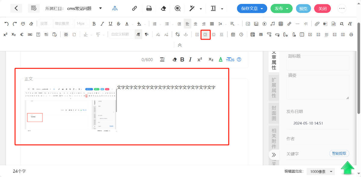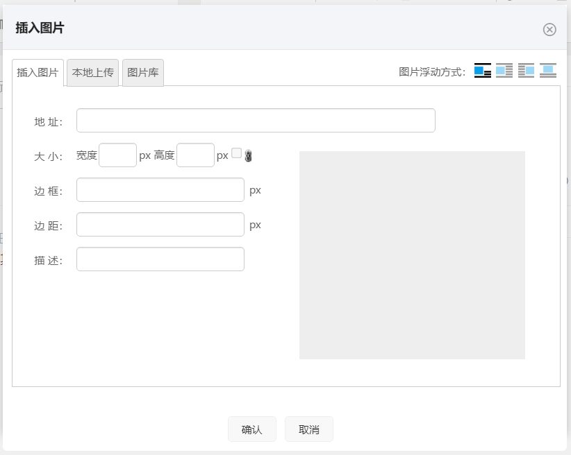 在文章内容中插入图片,从本地上传或建立图片库,从图片库调用图片,可调整图片浮动方式