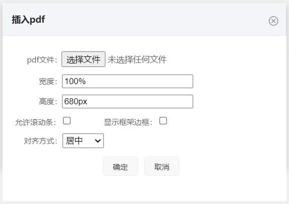 文章内容中可以插入pdf,可以设置网站页面上PDF显示的宽度、高度、滚动条框架边框和对齐方式等
