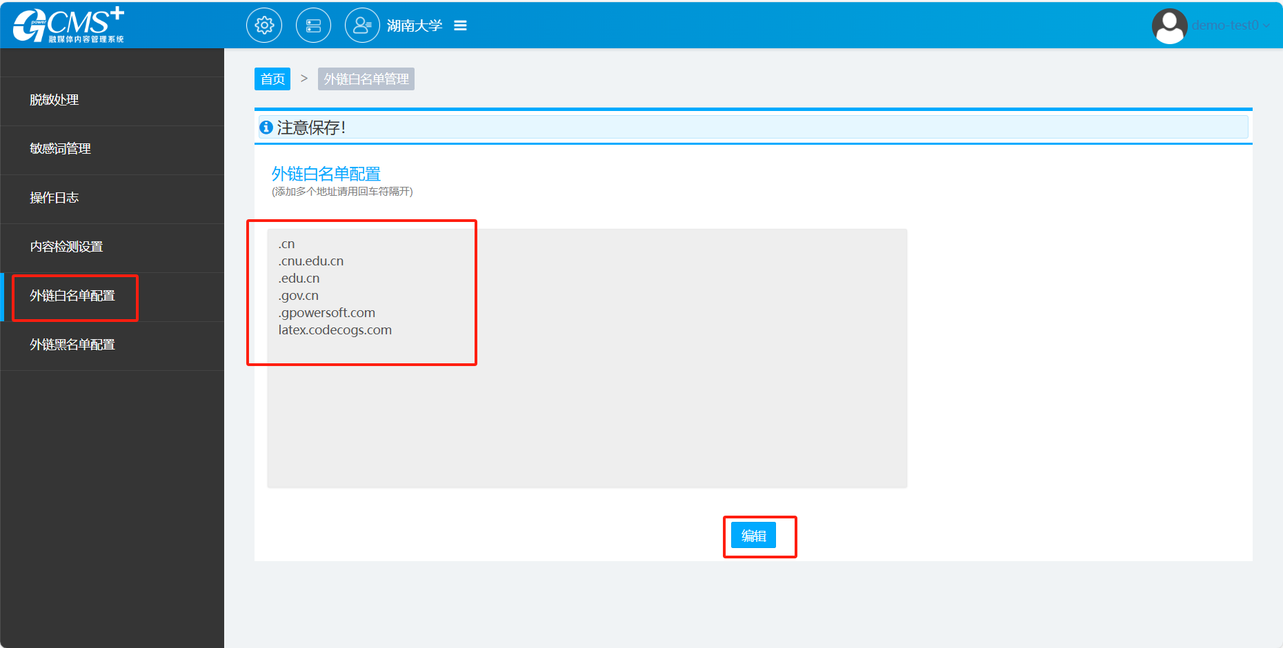 进入【外链白名单】,点击【编辑】,将可链接的地址输入保存即可;