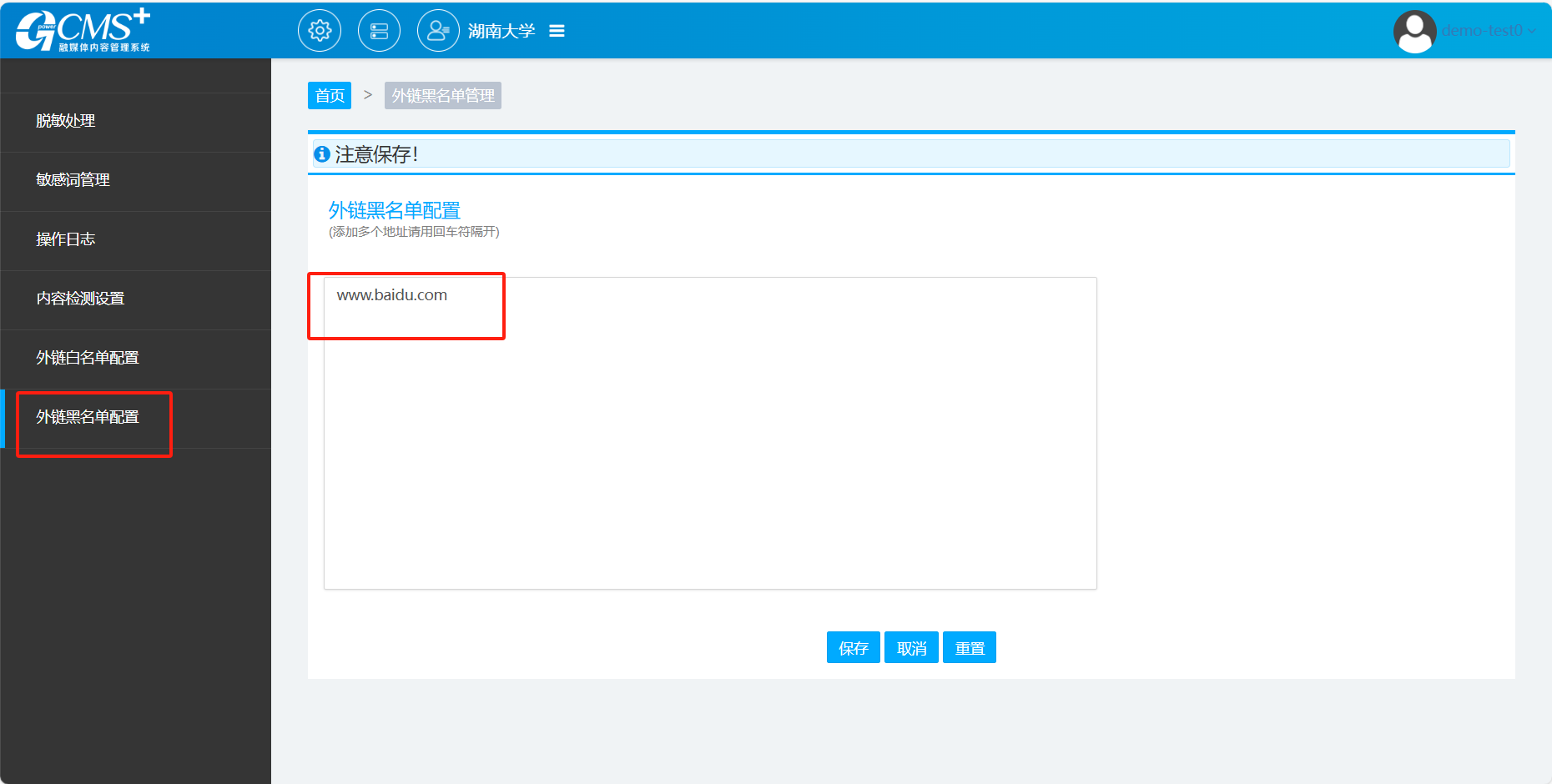 进入【外链黑名单】,点击【编辑】,将禁止链接的地址输入保存即可;