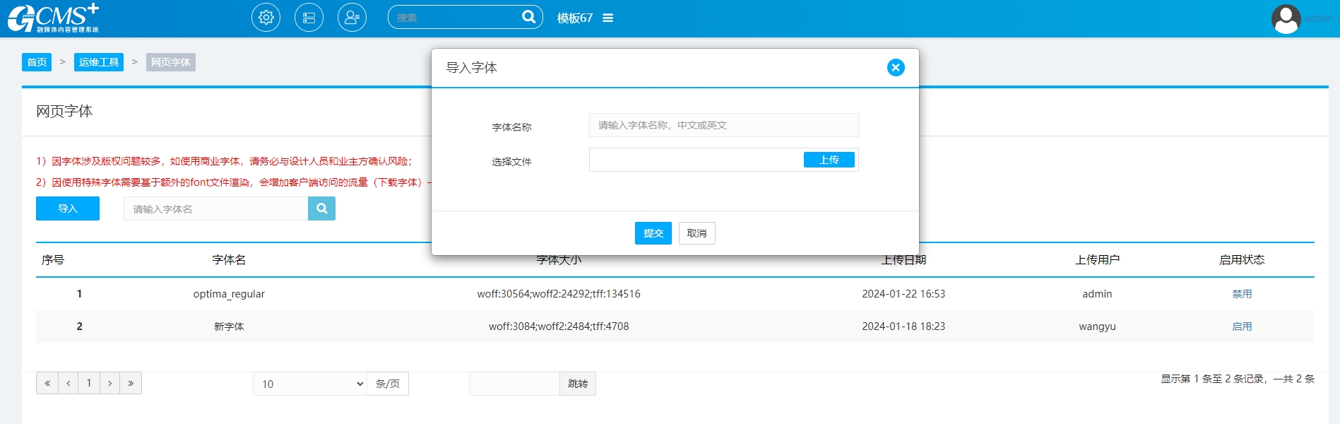 2.找到“网页字体”,选择“导入”,输入“字体名称”即为上述图片中可以看到的名字,一般默认追加到后面,自定义的名字建议加前缀G-字体名称;导入的文件格式分别为ttf,woff,woff2三个格式,并且文件名一定要相同。